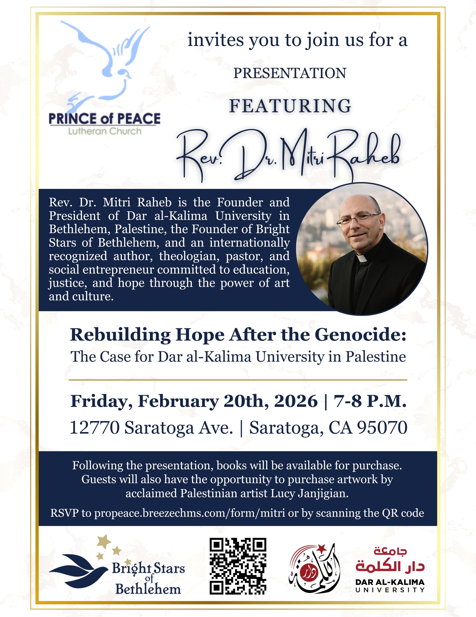 | February 20, 2026 from 7:00-8:00 p.m. | Prince of Peace Lutheran Church at 12770 Saratoga Avenue, Saratoga, CA 95070 | Rev. Dr. Mitri Rahab “Rebuilding Hope After the Genocide” | Rev. Dr. Mitri Raheb is a Palestinian Lutheran Pastor, founder of Bright Stars of Bethlehem/Dar-Al Kalima University. Following the lecture, there will be opportunity for conversation and artwork from a Palestinian artist as well as books will be available for purchase.RSVP here. |